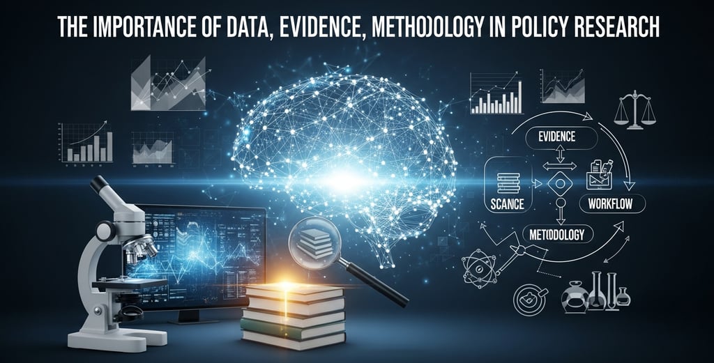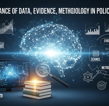 This blog explores why data, evidence, and methodology are fundamental to effective policy research and informed decision-making. It examines how reliable data reveals social realities, how evidence transforms information into insight, and how sound methodology ensures credibility and transparency. The article highlights the role of rigorous research in improving policy design, accountability, and adaptability, while acknowledging the importance of ethical and contextual considerations. Emphasizing the need for institutional capacity and collaboration, the blog argues that integrating data and evidence into policy processes strengthens public trust and governance outcomes. Ultimately, it presents robust policy research as essential for addressing complex challenges in a changing world.